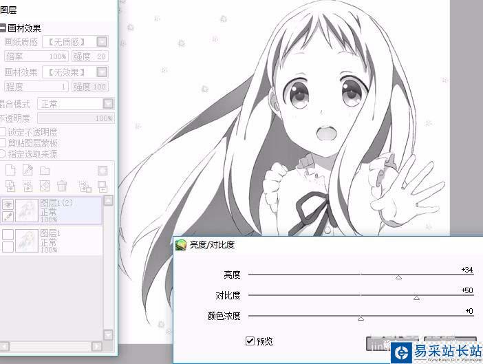 3、點選:濾鏡—>亮度/對比度,調整亮度和對比度,直到除了深色的部分以外,其他地方的線稿突出顯示(如圖),線稿顏色不夠深也沒有關系,可以之后再做調整。