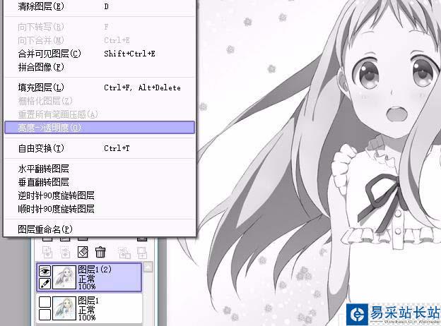2、復制一層,隱藏最下面的圖層,選中上面的圖層,點擊:圖層—>亮度-透明度 給圖片去色。