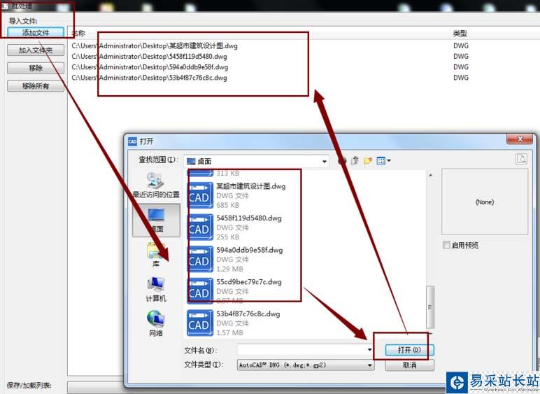 4、點擊“批處理”之后,會出現一個界面,點擊“添加文件”添加dwg文件。