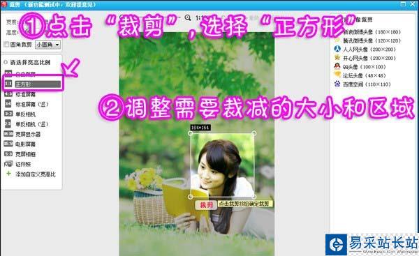 2、點(diǎn)擊軟件右上側(cè)的“裁剪”按鈕,跳轉(zhuǎn)到剪裁界面后,選擇“正方形”的寬高比例,調(diào)整需要裁減的大小和區(qū)域。