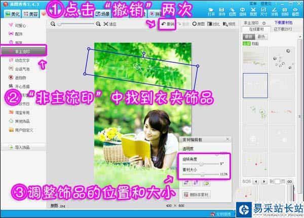 5、然后點(diǎn)擊“撤銷”兩次,返回原片狀態(tài)。再到“飾品”菜單下,在“非主流印”分類下,找到并點(diǎn)擊“衣夾”飾品,調(diào)整好飾品的大小和位置。