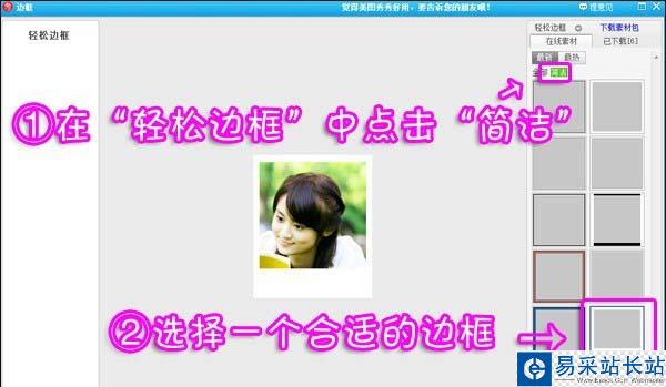 3、裁剪完后,進(jìn)入“邊框”菜單下選擇“輕松邊框”分類,點(diǎn)擊“簡(jiǎn)潔”,選擇一個(gè)“拍立得”效果的邊框素材。