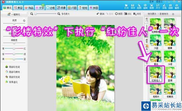 1、首先在軟件中打開待處理的照片,在“美化”菜單下選擇“影樓特效”,執(zhí)行“紅粉佳人”一次,讓照片更加亮麗。