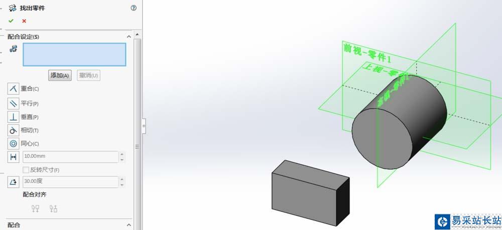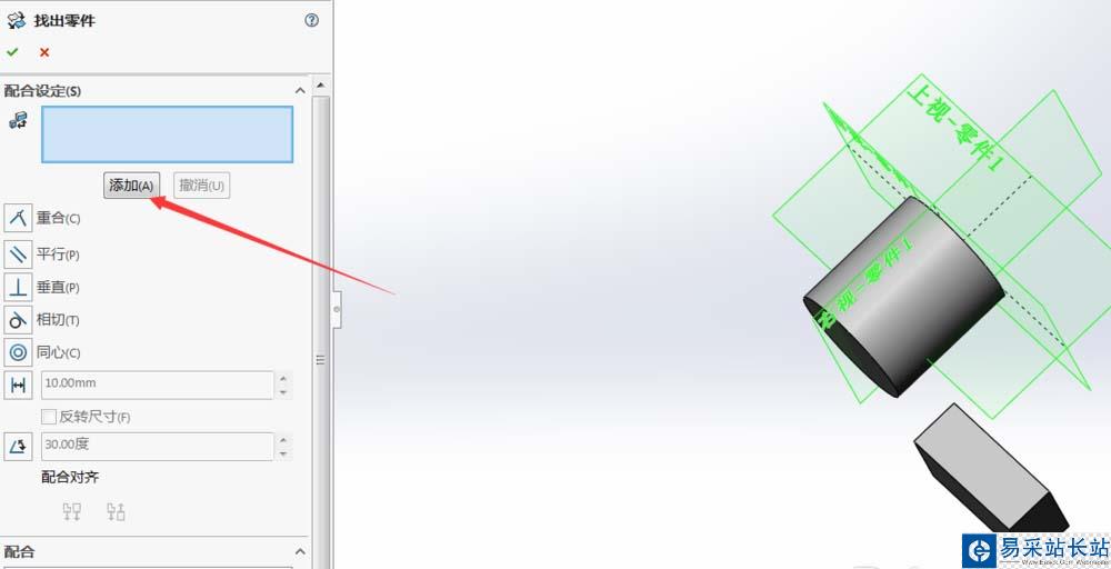 5、如下圖箭頭所示,可以像裝配體中一樣通過配合確定零件擺放位置,可以通過添加按鈕增加約束關系