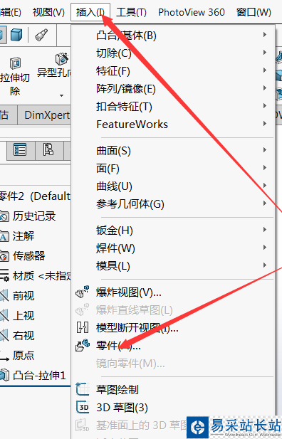 2、切換到長方體零件,鼠標單擊插入標簽展開下拉菜單,然后找到零件,如下圖所示