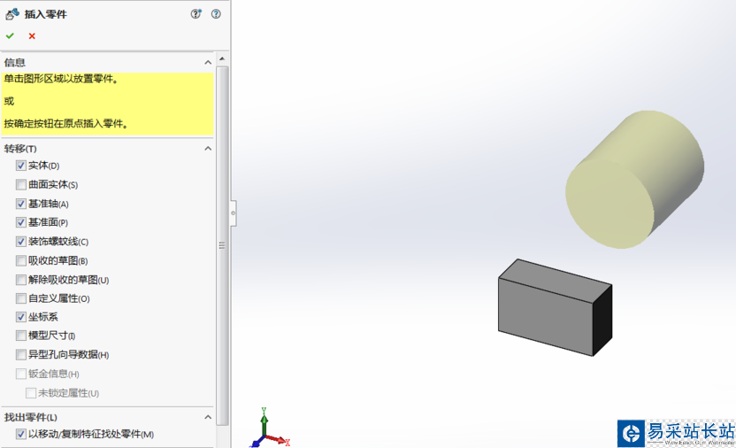 1、啟動solidworks并打開兩個零件。本例以簡單零件為主說明方法。如下圖