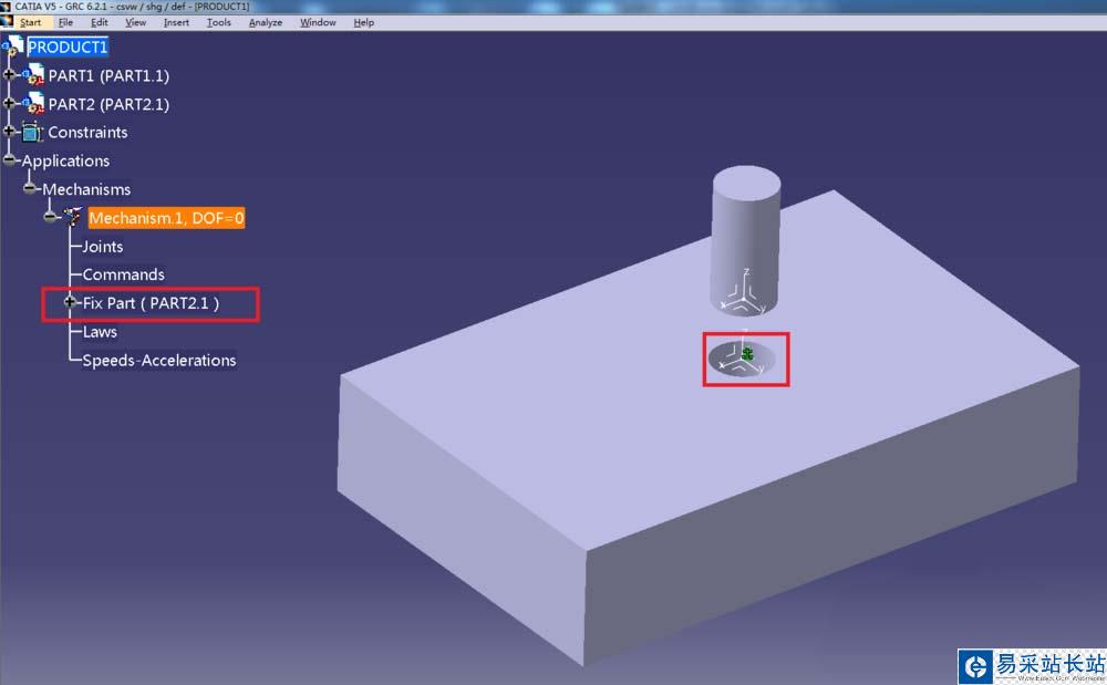 6、創建固定零件完畢后,可以看到紅框中的特征。零件上有個綠色的錨,另外特征樹中可以在對應的機構下面找到Fixed Part。