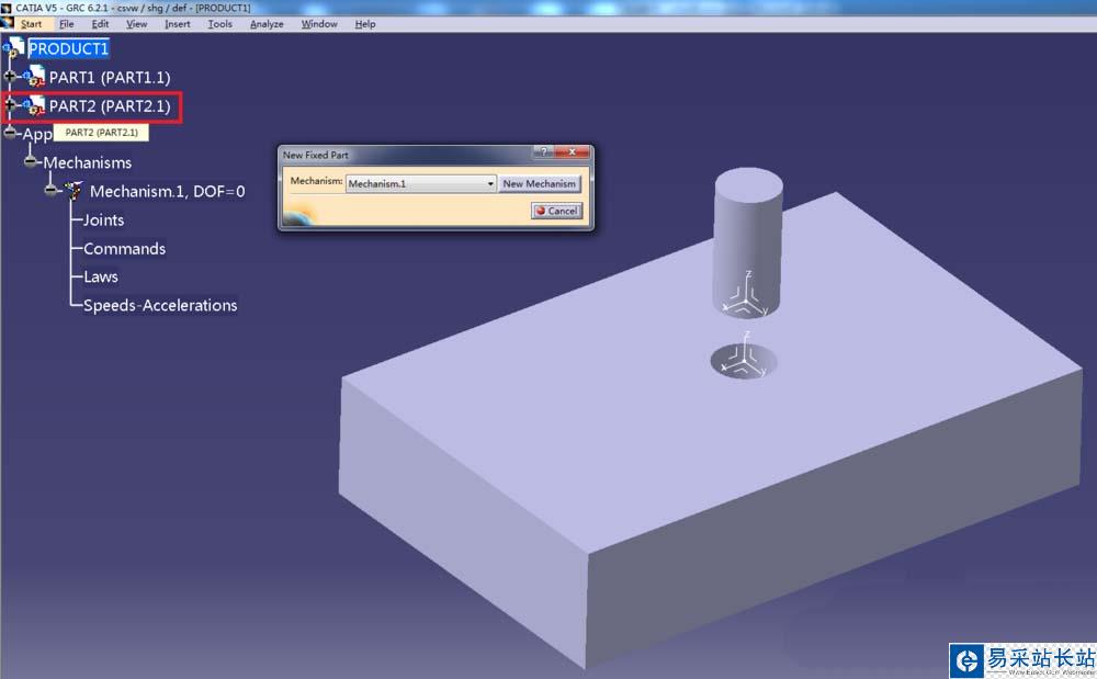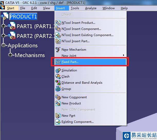 5、每個機構都必須有且僅有一個固定件Fixed Part,點擊Insert新建一個Fixed Part,注意在彈出的對話框中選擇對應的機構,目前圖中對應的是Mechanism1,然后點擊一個零件作為固定零件