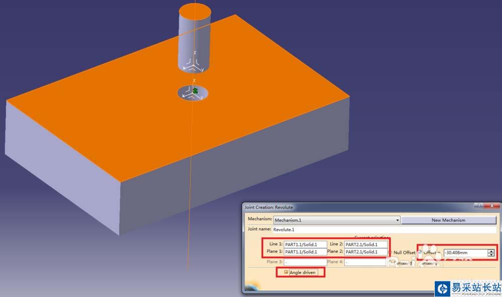 8、在對話框中,兩條line分別選擇圓柱的軸線和圓孔的軸線(軸線可以通過點擊圓周面來選擇),兩個plane分別選擇圖中高亮的兩個面,根據實際情況選擇性勾選offset,然后在Angle Driven前面打上勾,表示這個機構的運動來源是這個鉸鏈的角度在動,由于之前已經定義過固定零件,所以我們知道肯定是圓柱在動了。