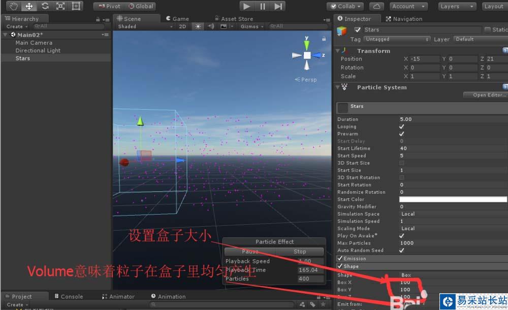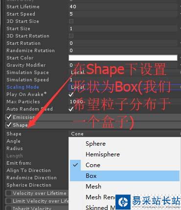 6、在Shape下,我們修改的是粒子生成裝置的形狀。我們改成一個Box(我們希望星星是從一個大盒子里生成的)