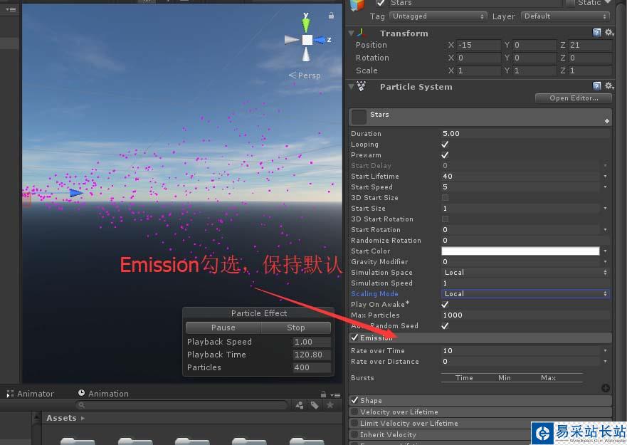 5、Emission模塊保持勾選,無需改動保持默認即可。如果希望加快星星的產生,可以增大Rate over Time選項。