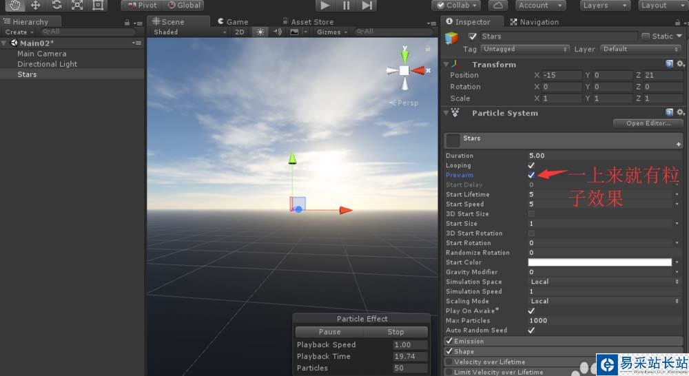 3、勾選Prewarm. 字面意思就是預熱。就是場景一開始,就已經有很多粒子(粒子產生和消失已經平衡),如果不勾選,一開始什么都沒有,等一會粒子數才變多。