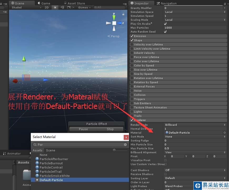 8、展開Renderer, 為Material屬性賦值,設置粒子的樣子(材質)。 使用自帶的Default-Particle就可以。最終效果如圖。