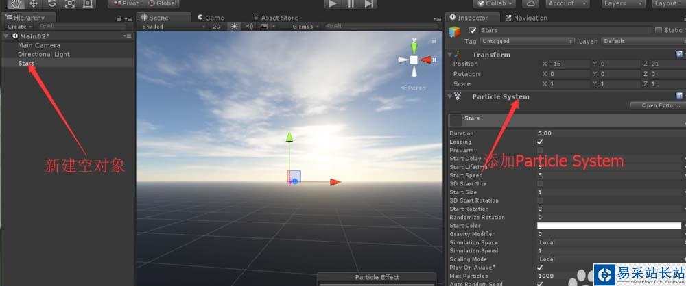 2、新建一個空對象命名為Star, 為其添加Particle System組件。注意:一個對象最多只能有一個Particle System組件。