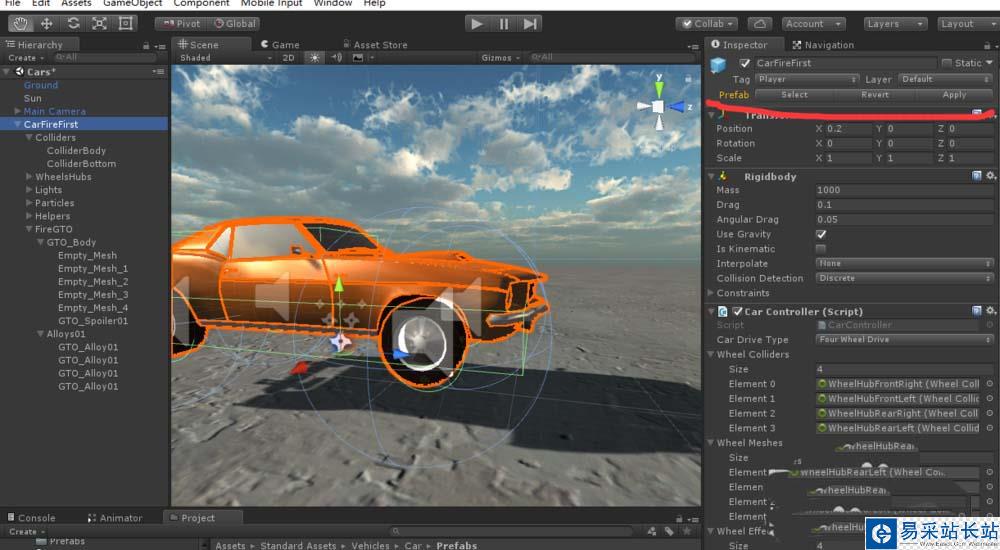 4、下面說徹底斷開的辦法。首先把這個變成白色了的游戲對象拖動到Project面板中再創建預制體(CarFireFirst),這樣就改變了該對象關聯的預制體。