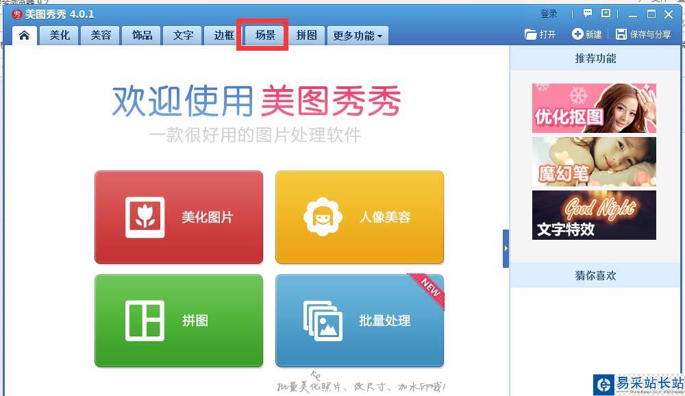 1、你要安裝有美圖秀秀,接著在桌面雙擊打開美圖秀秀的主界面,并且點擊上面的場景圖標。