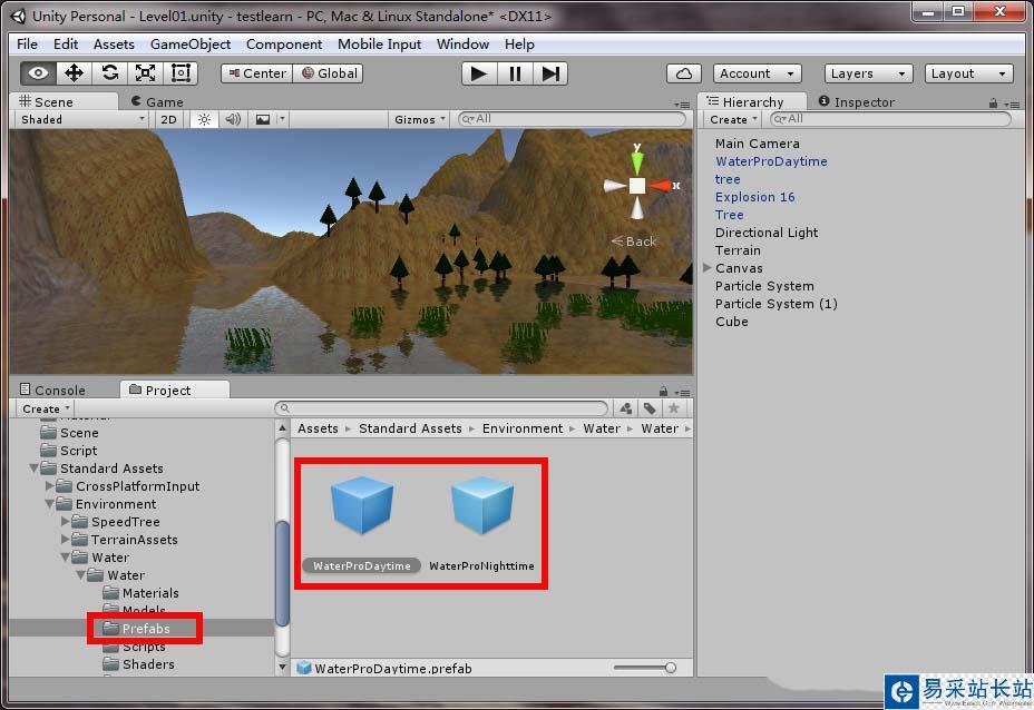 7、打開“Water(Basic)”文件夾在“Prefabs”中把“WaterBasicDaytime”或“WaterBasicNightime”添加到場景中可以得到波光粼粼的水面效果。