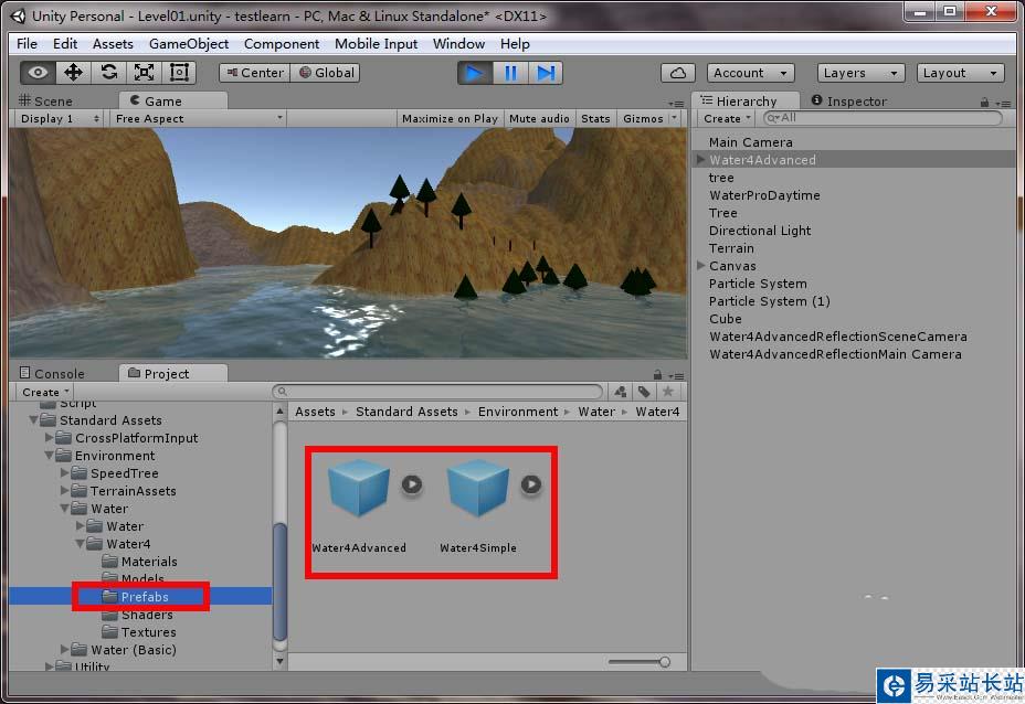 6、在“Water4”文件夾的“Prefabs”中“Water4Advanced”或“Water4Simple”同樣添加到場景中,我們會得到海洋的洋面一樣的效果。