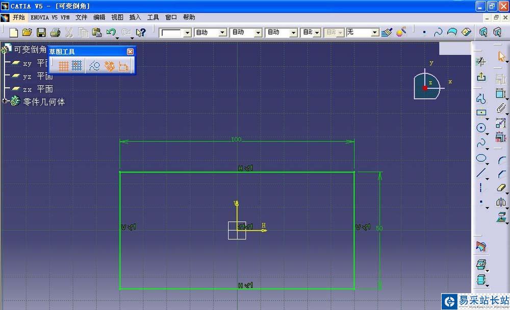 3、以xy平面為基準(zhǔn)面進(jìn)入草圖界面,繪制一個(gè)矩形,尺寸為50×100,操作完成后退出草圖界面;