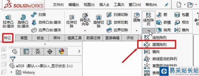 3、點擊【特征】中【線性陣列】下拉按鈕,選擇【圓周陣列】功能選項