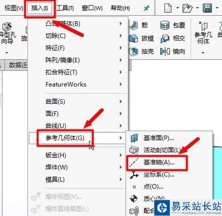 1、點擊【插入】菜單欄中的【參考幾何體】下的【基準軸】