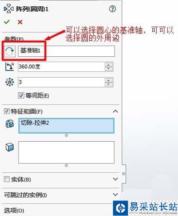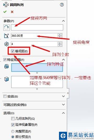 4、在左側彈出的對話框中按照要求選擇或輸入相應的特征等,這里需要注意在圓周陣列時,選擇等間距(等間距前面方框打鉤)可以按照指定度數等距陣列。
