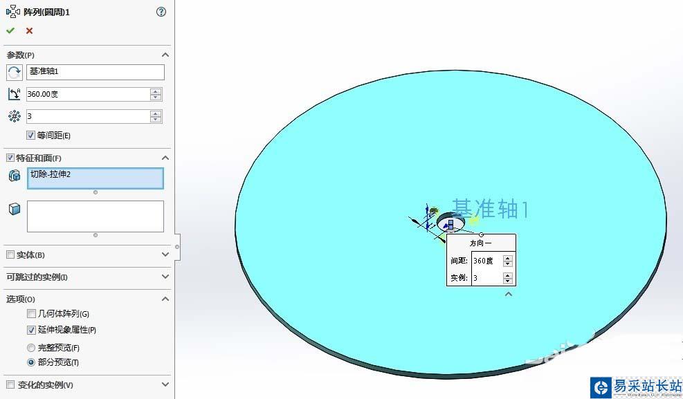5、方向選項中,如果是規則外邊緣圖形(圓形)可以選擇圓形外邊框線,如果遇到不規則圓形,就需要建議一個基準軸,待陣列特征會以基準軸為圓心進行陣列。