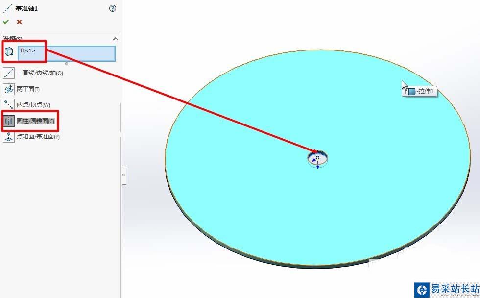2、在左側彈出的對話框中,先選擇【圓柱/圓錐面】然后在上面的選項框中選擇相應的面,點擊對勾即可建立一個基準軸。