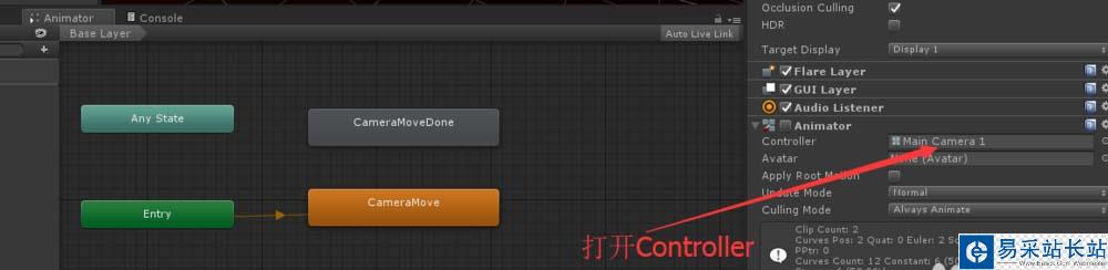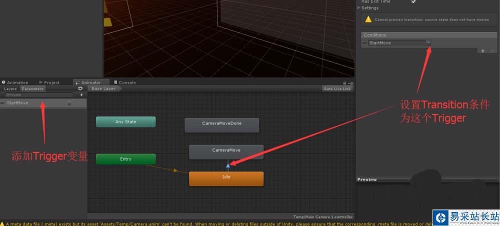 6、接著選中攝像機,在Animator組件下打開Controller: Main Camera 1,添加Trigger變量StartMove, 添加一個空狀態Idle設置為默認,接著設置從Idle到CameraMove的Transition條件為該Trigger。接著再設置從CameraMove到CameraMoveDone的Transition如圖。