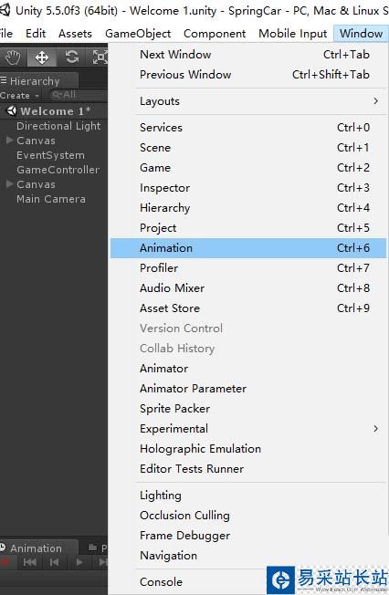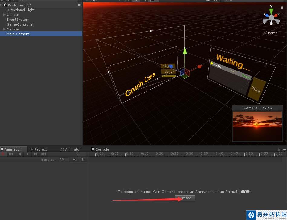 2、從Window->Animation打開動畫編輯器,然后選中相機,點擊Create創建動畫片段anim文件,選擇保存路徑。