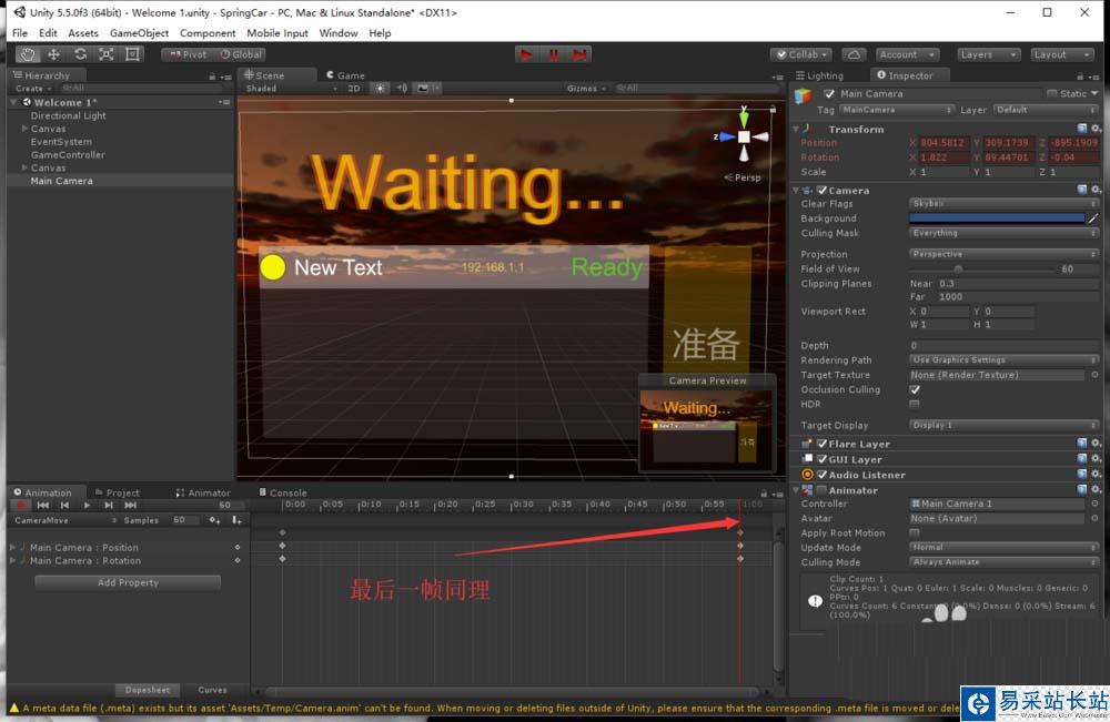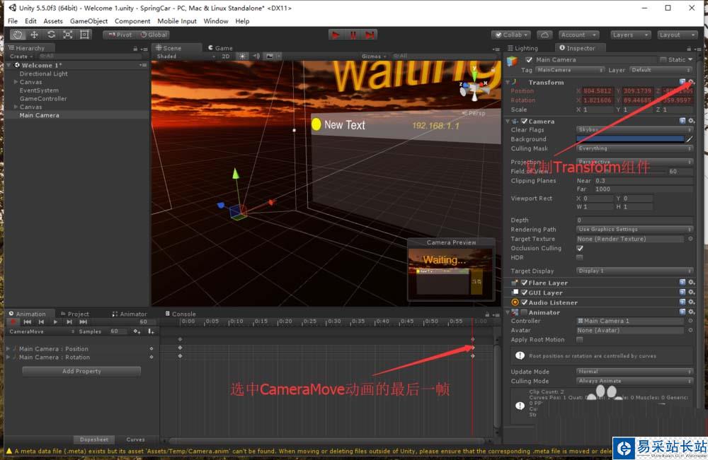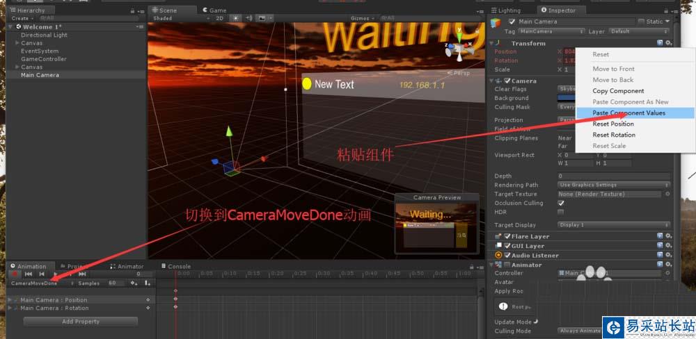 5、然后我們新建一個動畫叫做CameraMoveDone, 就是扭頭結束后的狀態。只有一幀就夠了。我們把動畫片段CameraMove的最后一幀時,相機的Transform組件直接復制過來即可。