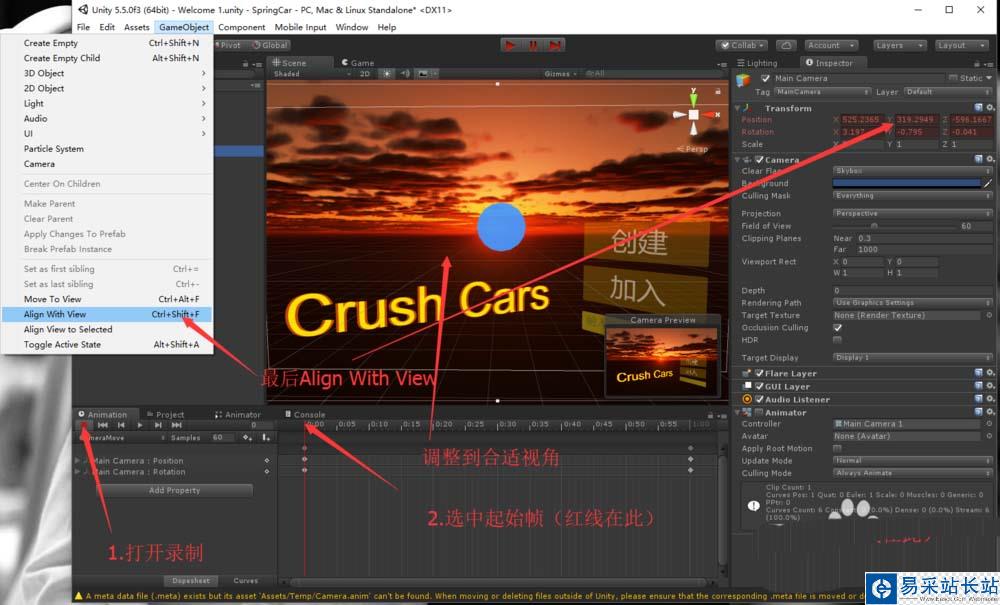 4、開啟錄制按鈕,移動到第一幀,調整視角對準第一個UI界面,然后Align With View, 同理設置最后一幀。這樣子一個簡單的扭頭動畫就做好了。