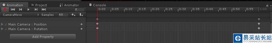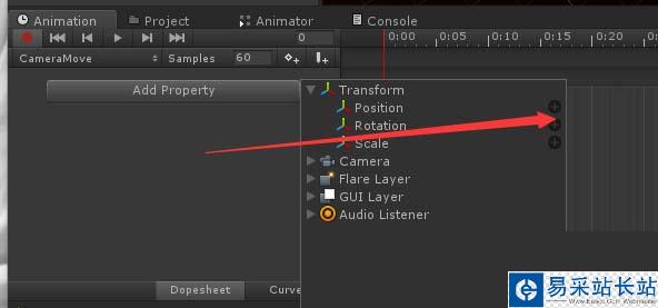 3、創建好以后,在Animation編輯器中,點擊Add Property添加屬性。把Transform組件的Position和Rotation添加進來。