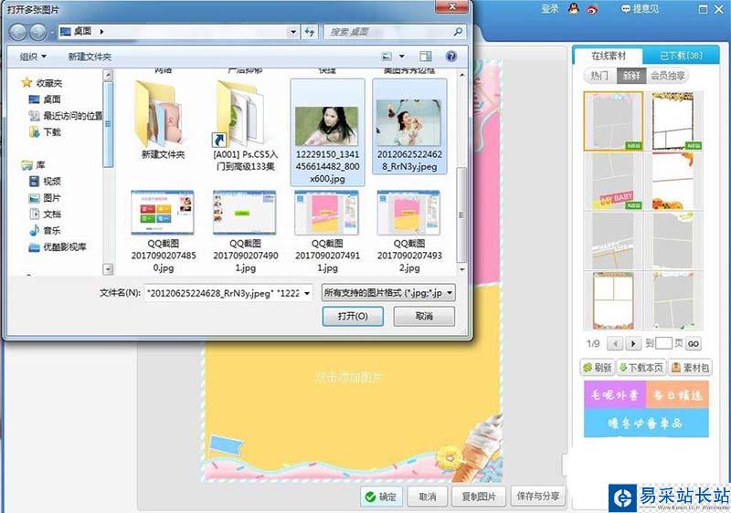 2、點擊右側(cè)選擇喜歡的海報素材,點擊添加多張圖片,按住ctrl鍵先后點擊選擇兩張圖片,點擊打開。