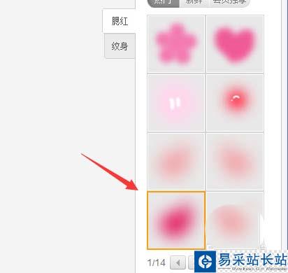 5、點美容飾品選項,在右側(cè)選擇腮紅選項,并在其內(nèi)選擇一種預(yù)置效果,如圖所示: