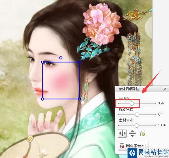 6、點擊選擇的腮紅效果,將其拖拽到人物的面部,并調(diào)節(jié)透明度參數(shù)如圖所示: