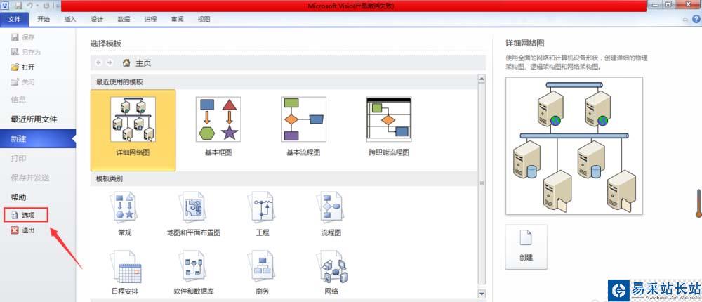 2、打開Microsoft Visio軟件,在上方菜單欄【文件】選項里找到【選項】功能菜單,如下圖所示。