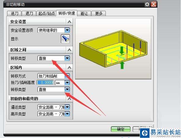 5、在非切削移動里設置:轉移/快速-區域之間-區域內(均設為直接)。設置完成,就能走出合理的雙向加工刀路。