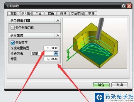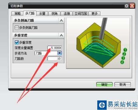 3、在切削參數里設置:多刀路-多重深度(設置總深度與每一刀進刀量或者設置總深度與總刀路數),根據刀具大小和粗精加工的要求來確定進刀量和總刀路數。