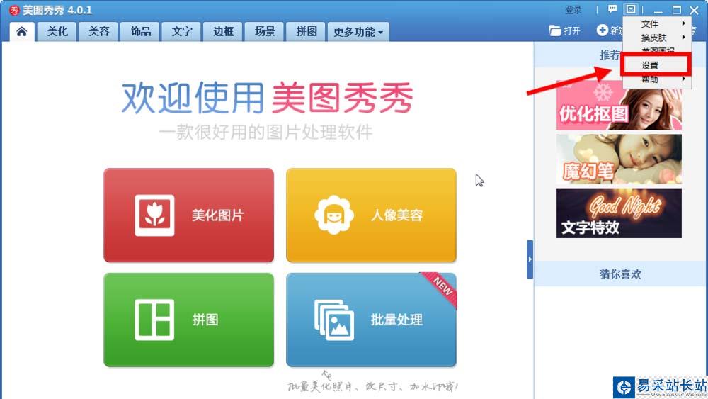 3、以下是徹底關閉美圖畫報的操作方法:點擊美圖秀秀主頁面右上角的倒三角形,然后鎖定“設置”選項,點擊進入。