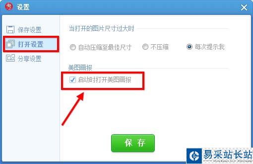 4、在“設置”標簽頁下,左側菜單選擇“打開設置”。然后你會發現美圖畫報那項是打鉤的,點擊將鉤鉤取消。