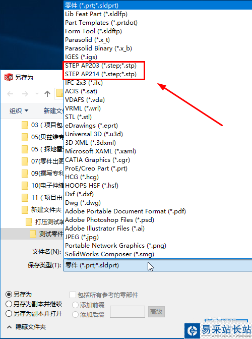 4、彈出保存零件類型,選擇stp格式,有兩種版本,根據自己需要選擇,如圖所示