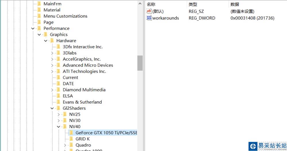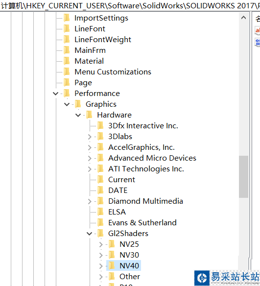 2、找到[HKEY_CURRENT_USER]/Software/Solidworks/SOLIDWORKS 2017/Performance/Graphics/Hardware/