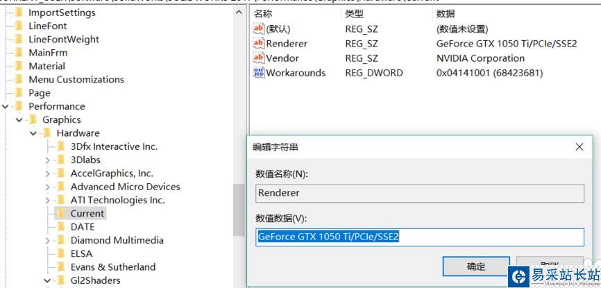 3、找到Hardware名錄下的current單擊,右側文本框出現Renderer單擊打開。數值數據下顯示的是你的顯卡名稱。(這里的名稱與直接點顯卡屬性的名稱不一樣,很多人這里錯在這里)然后復制顯卡名稱。