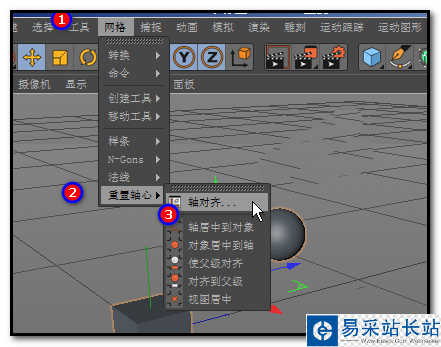 4、現在,需要把軸心移到物體中心上。那么,我們需要這樣操作:在界面的菜單欄上點:網格,彈出的菜單中點:重置軸心-軸對齊