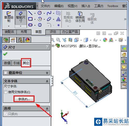 4、標注出來的字體一般比較小,會看不清楚的。在尺寸屬性上點擊其它,選擇字體,如圖所示