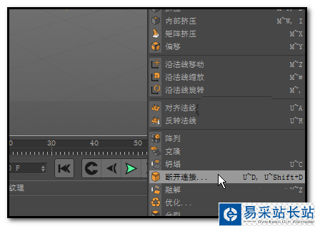 5、鼠標在空位置右擊,彈出菜單中點:斷開連接。鼠標再點住X軸向的箭頭,把這兩個面拉出來。這兩個面就與立方體主體分離出來了。