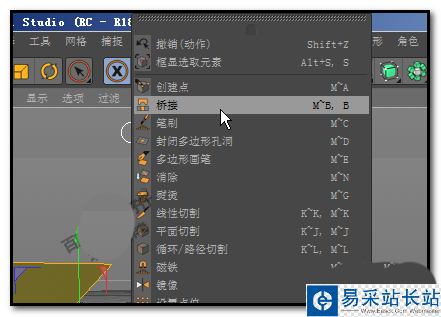 6、旋轉下場度,然后,鼠標右擊,彈出菜單中點:橋接。在界面左側的圖標中,選擇:邊圖標。鼠標從一個三角面的點劃過另一個三角面的點,把缺的2個面給補上。這就做成了一個三角形物體。