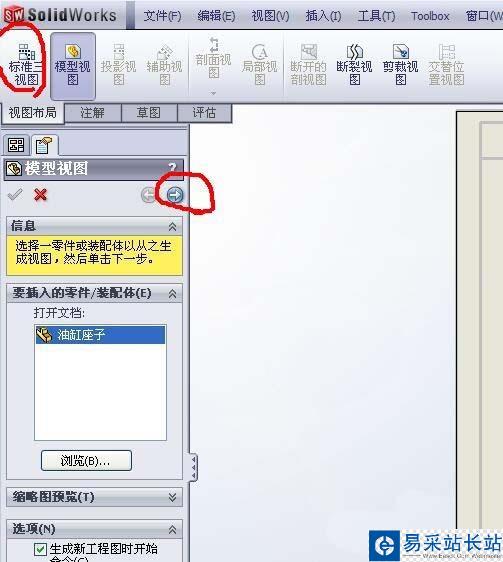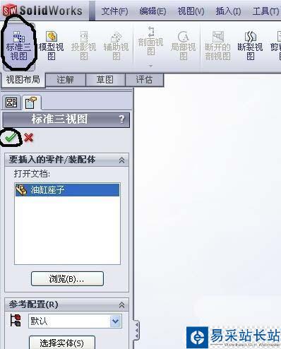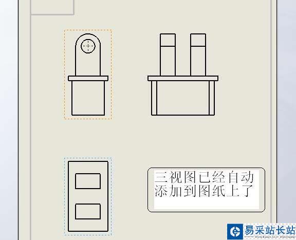 4、選擇標準三視圖選項,然后點標準三視圖下面的對號,就能看到三視圖已經自動分配到了圖框中了。
