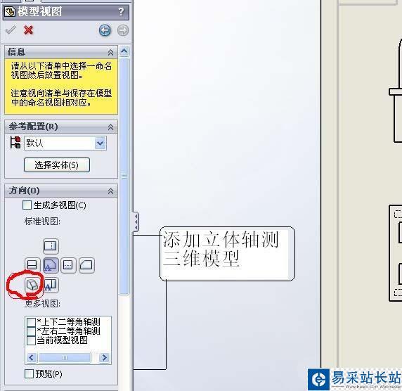 5、為了圖紙的清晰完整,讓讀圖的人一眼就能看出圖紙是什么零件,添加一個三維模型的軸測圖至關重要。這里選擇軸測圖,就能自定義添加立體模型了,往圖紙適當的位置點一下,就完成了。